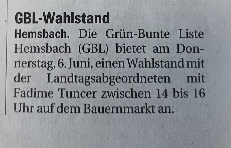 Die GBL HEMSBACH steht für eine Politik, die auf Offenheit, Toleranz und Dialog setzt!