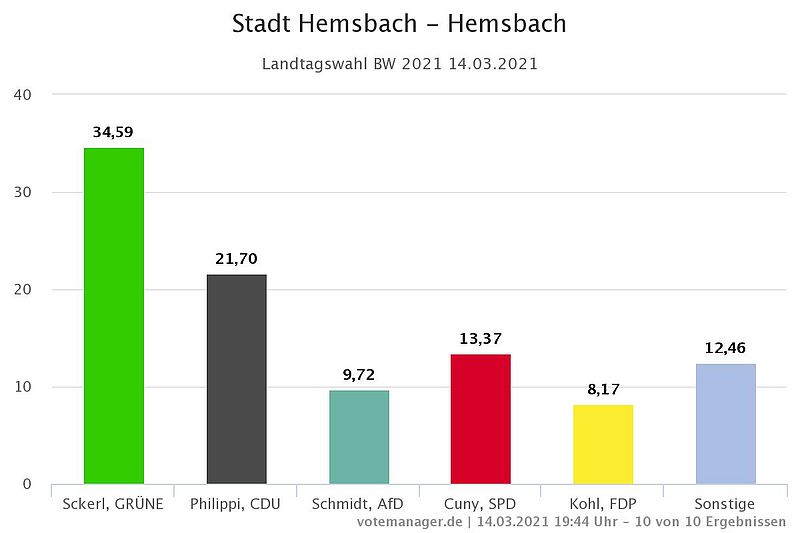 Jürgen Kirchner wird neuer Bürgermeister von Hemsbach. Er erreichte am Sonntag im zweiten Wahlgang 39,8 Prozent der Stimmen. Thomas Pohl schaffte nur 37,0 Prozent; Christian Falter landete mit 23,0 Prozent auf dem dritten Rang. Die Wahlbeteiligung betrug 65,3 Prozent.